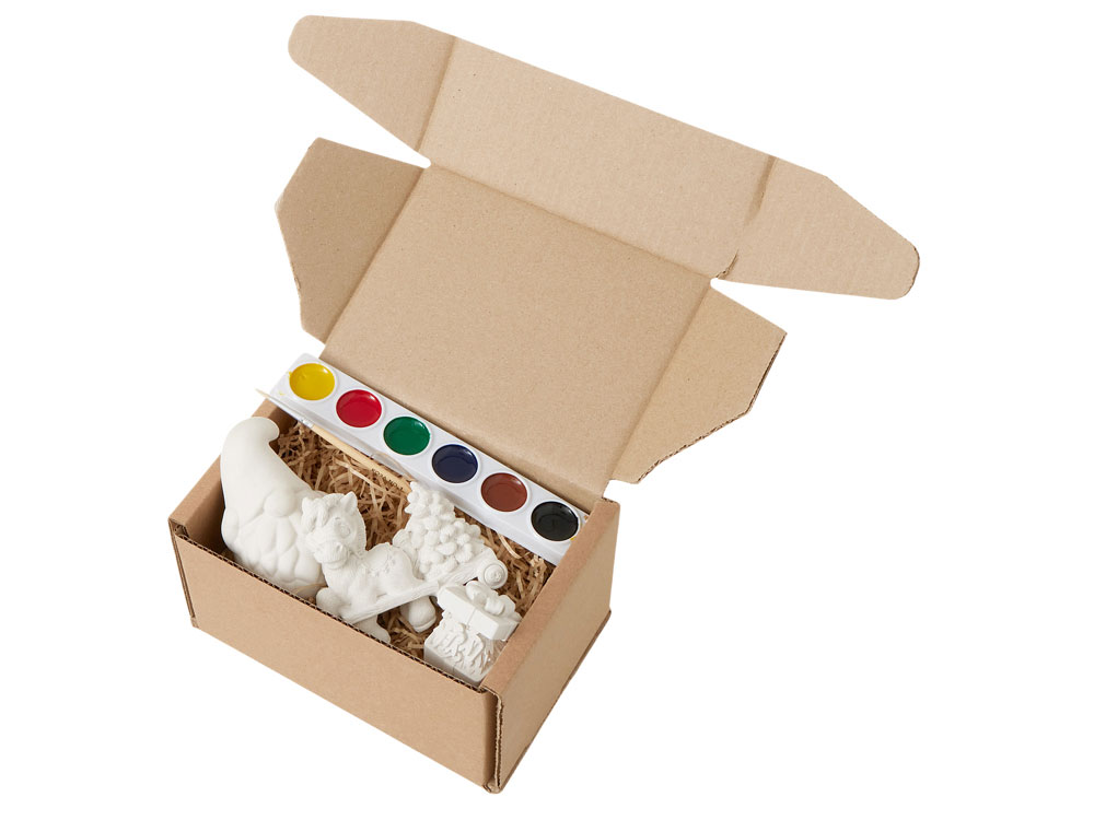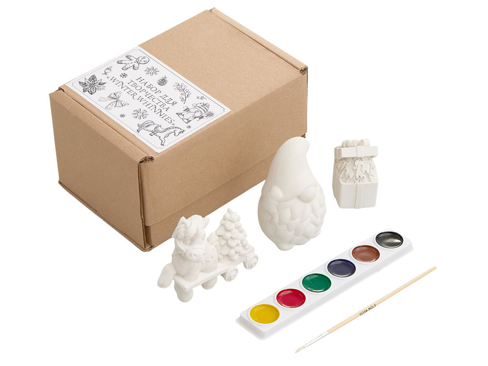 Набор для творчества «Winter Whinnies» станет прекрасным подарком в год Лошади и позволит приятно провести время на каникулах всей семье. В набор входят три гипсовых фигурки — лошадка елочкой, гном подарочная коробка с пряничными человечками, а также акварельные краски и кисть. Игрушки можно покрывать краской в несколько слоев, чтобы дополнить дизайн яркими деталями. Акварельная краска легко смывается теплой водой, поэтому игрушки можно неоднократно раскрашивать – достаточно смыть краски и дать изделиям высохнуть. • Символ года Лошади • Интересное занятие для детей и взрослых • Можно раскрашивать много раз